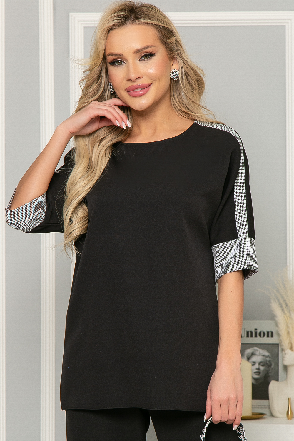 Костюм-двойка, состоящий из классических брюк прямого кроя и блузы прямого кроя кроя. Данный комплект можно носить, подчеркнув талию поясом из основной ткани или же, заправив блузу. В обоих вариантах костюм будет смотреться интересно. Брюки по талии на резинке, в боковых швах есть карманы. Блуза прямого кроя, по бокам есть разрезы. Пояс из основной ткани входит в комплект.