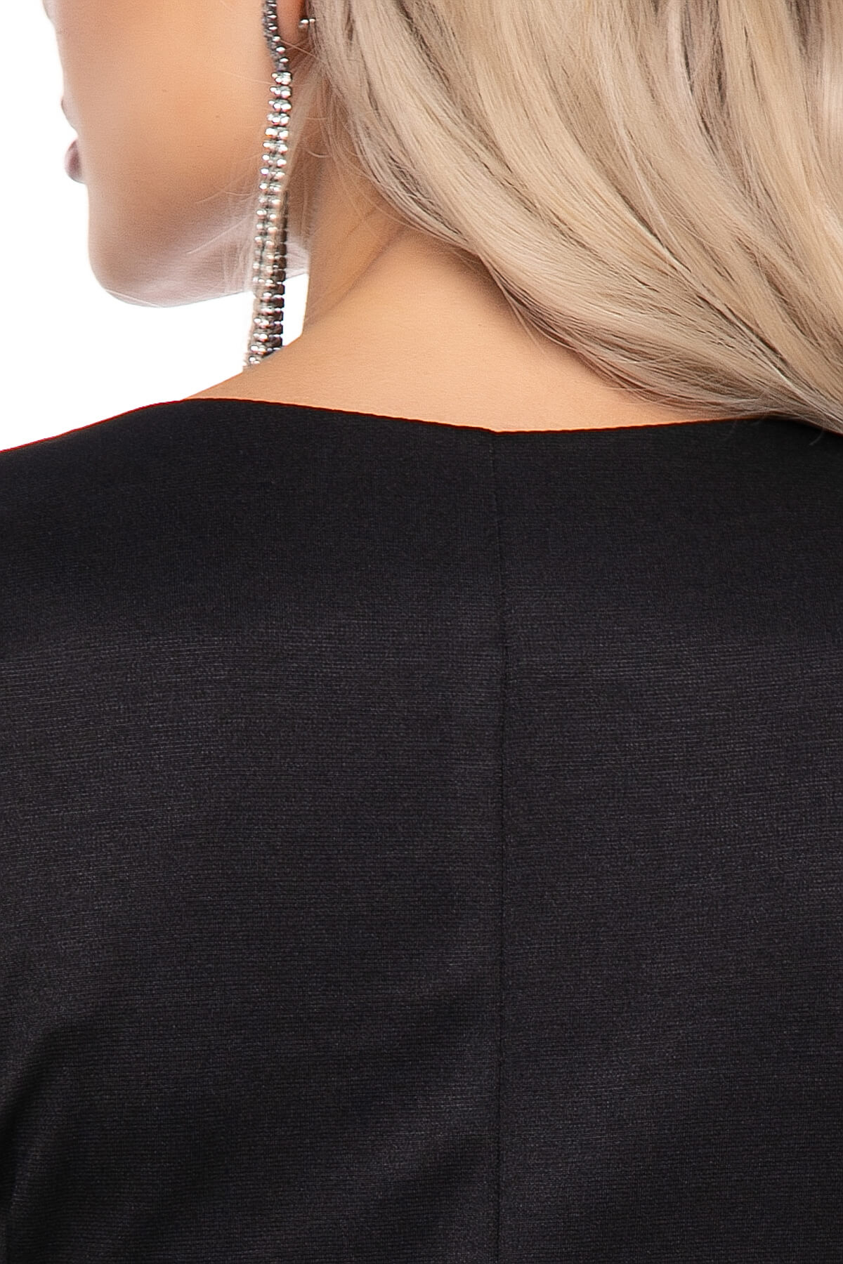 Вечернее платье прилегающего силуэта в мерцающем чёрном оттенке. Эффектное платье с V-образным вырезом. Перед скроен по принципу платья с запахом со сборкой в области талии. По низу изделие скруглено, что визуально удлиняет ножки. Шикарный вырез идеально подчеркивает зону декольте. Платье без подкладки.