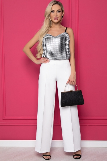 Широкие и комфортные брюки дополнят капсулу в гардеробе современной женщины. Брюки со стрелками делают образ элегантным, идеально сидит на фигуре любого типа благодаря завышенной линии талии, а также отстроченным и заутюженными стрелками по всей длине переда, которые визуально стройнят и вытягивают ноги, делая их длиннее. Эти брюки - идеальный выбор для создания офисных или повседневных образов. В боковом шве потайная молния.