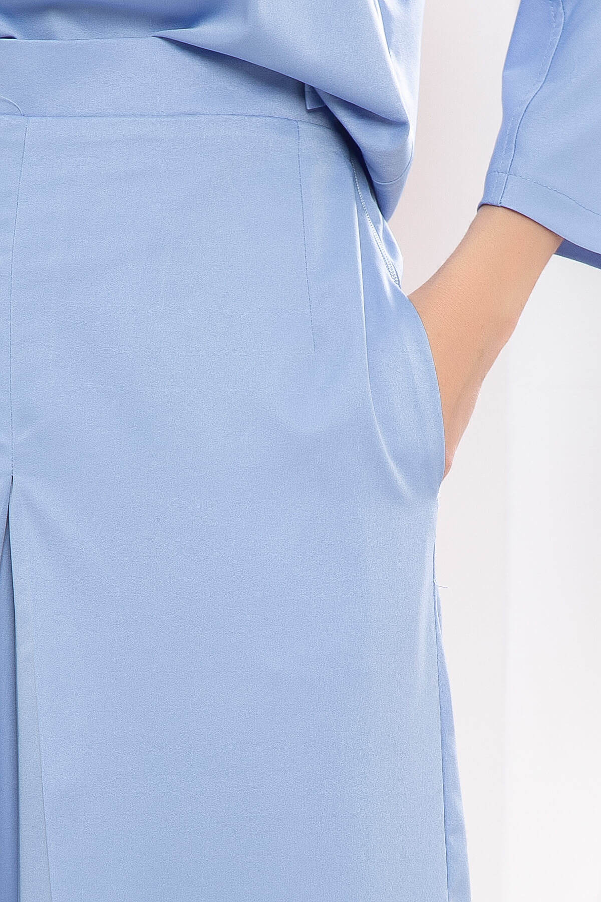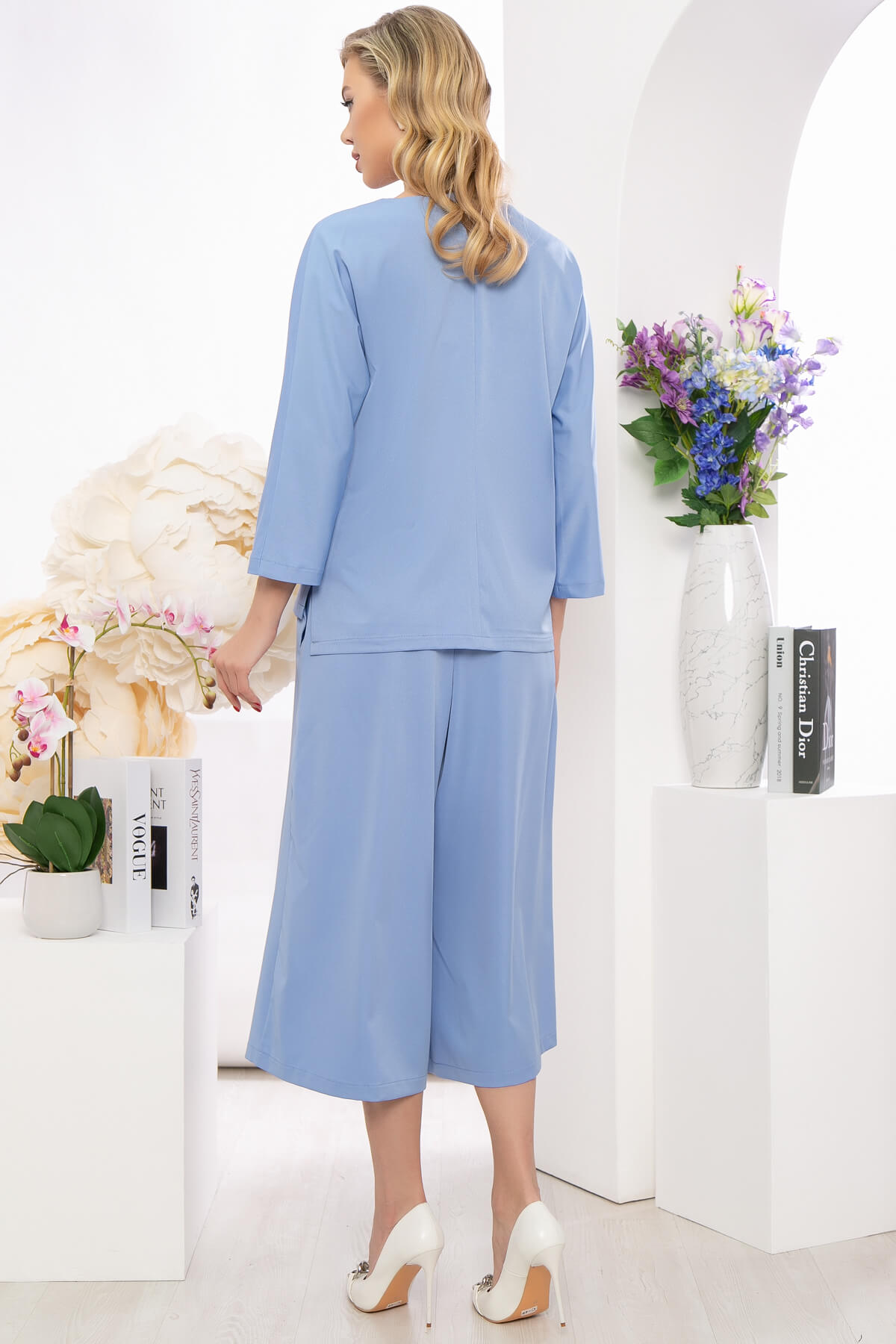 Костюм из лёгкой костюмной ткани в красивом голубом оттенке подойдёт для создания повседневного или стильного делового образа. Отдельного внимания заслуживает нижняя часть костюма. Юбка-шорты - эффектная альтернатива брюкам. Свободный крой не сковывает движений и дарит комфорт. В комплект входит пояс из основной ткани.