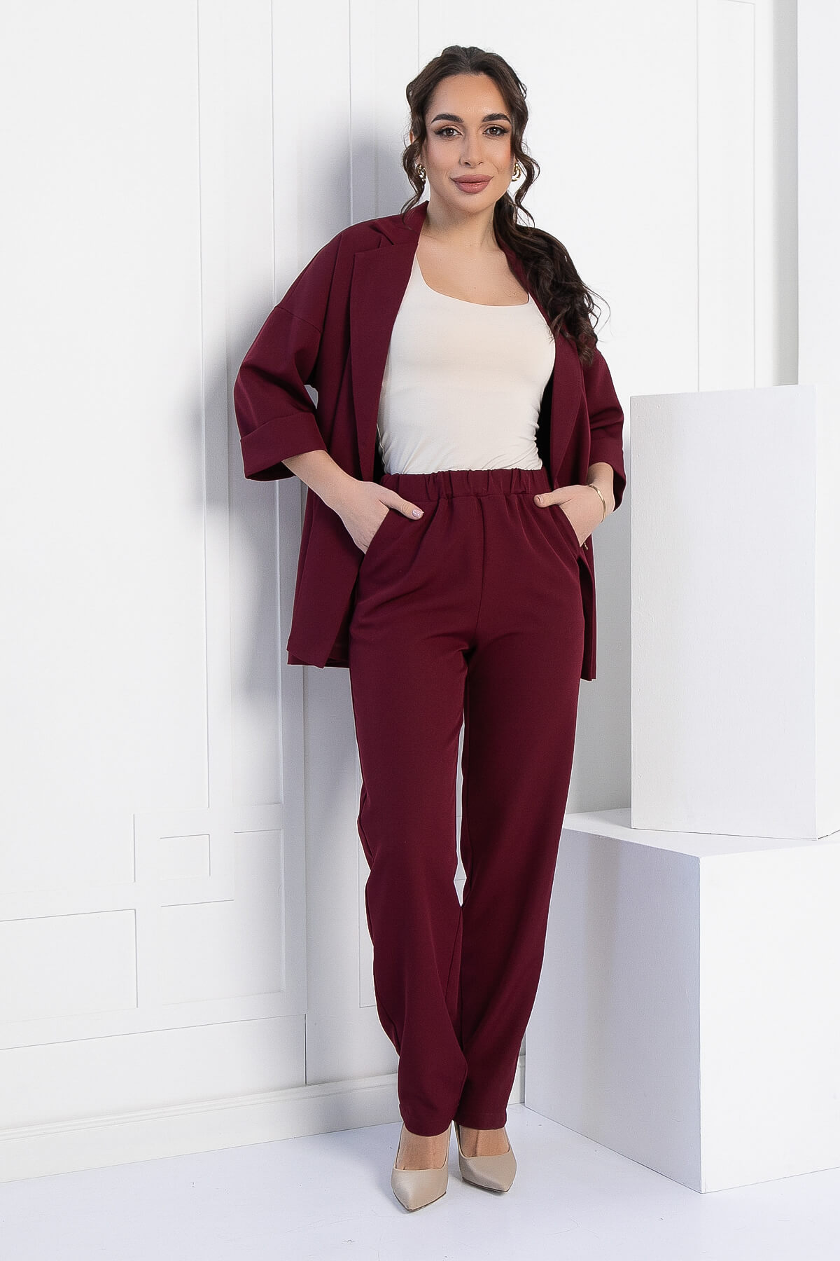 Стильный комплект состоит из пиджака свободного кроя и брюк прямого кроя, которые идеально дополняют друг друга! Пиджак оснащён английским воротником и спущенным плечом, что придаёт ему расслабленный и модный вид. Брюки по талии на резинке, что обеспечивает максимальный комфорт. В боковых швах расположены удобные карманы, а зауженный к низу силуэт добавляет элегантности и стройности. Этот комплект станет отличным выбором для любого случая, позволяя вам выглядеть стильно и уверенно!