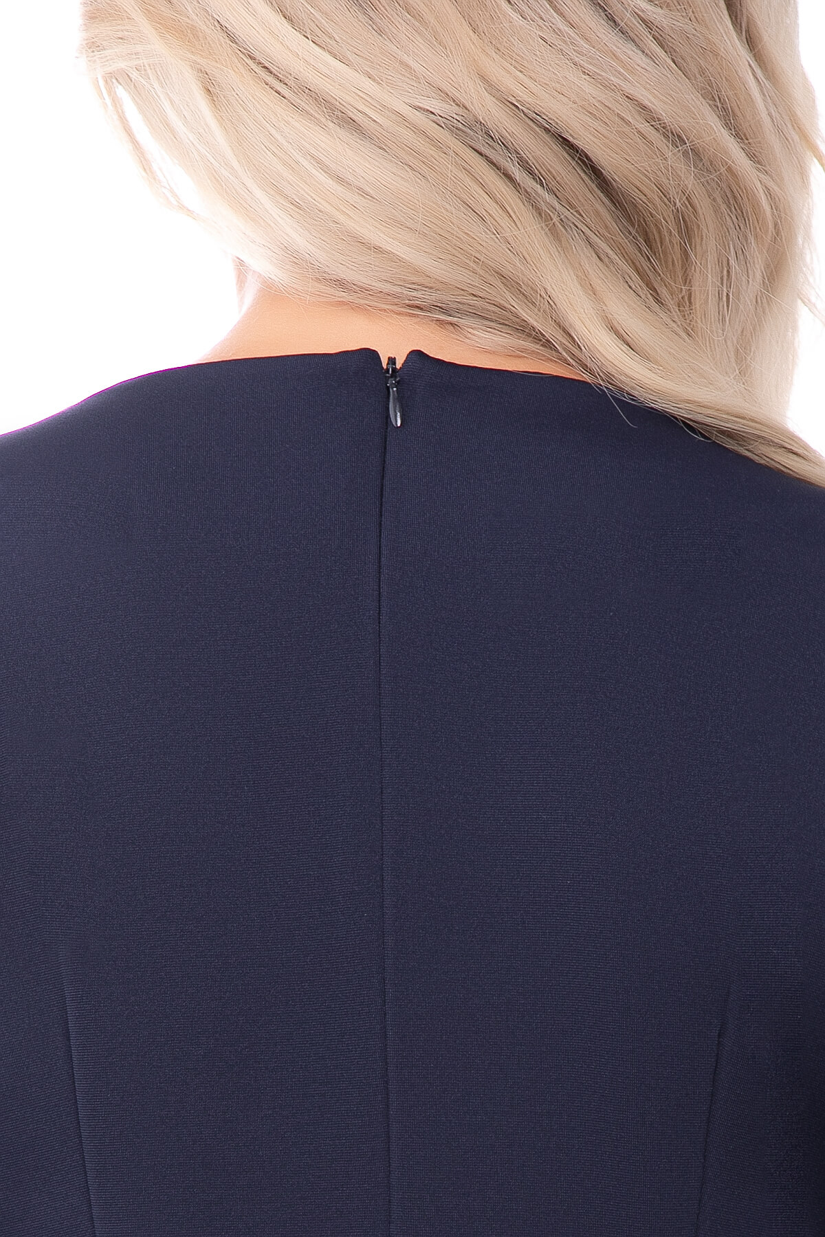 Элегантное платье подходит для создания офисного образа. Оно строгое, при этом наполнено женственными элементами, которые украшают изделие. Акцентный элемент на талии визуально скорректирует фигуру. По спинке изделия - молния. По низу юбки сзади есть разрез. Изделие украшено вставкой из экокожи по талии.