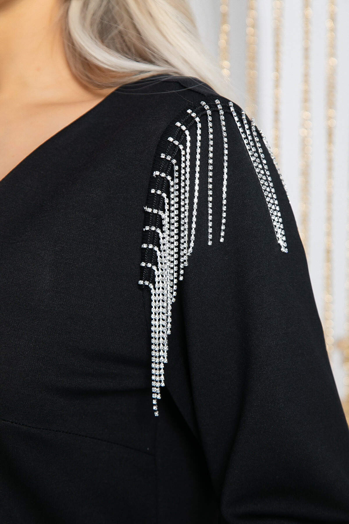 Очаровательное платье, которое внесёт в ваш образ нотку роскоши и элегантности! Спереди оно украшено изысканным разрезом, что придаёт ему особый шарм. Пояс из основной ткани, который идёт в комплекте, выгодно подчёркивает талию и создаёт гармоничную силуэтную линию. А лента из страз, вшитая в окат рукава, придаёт платью дополнительный блеск.