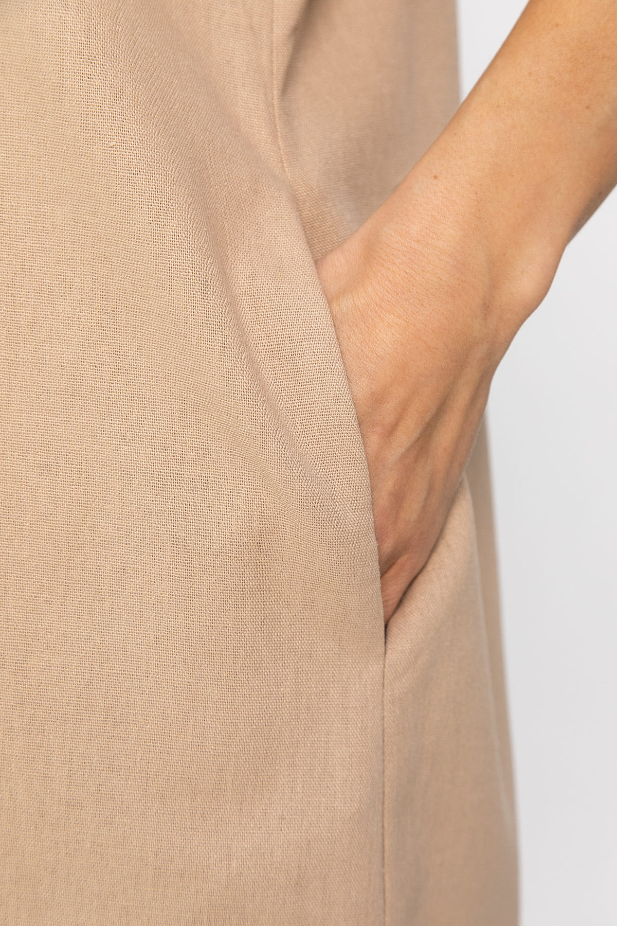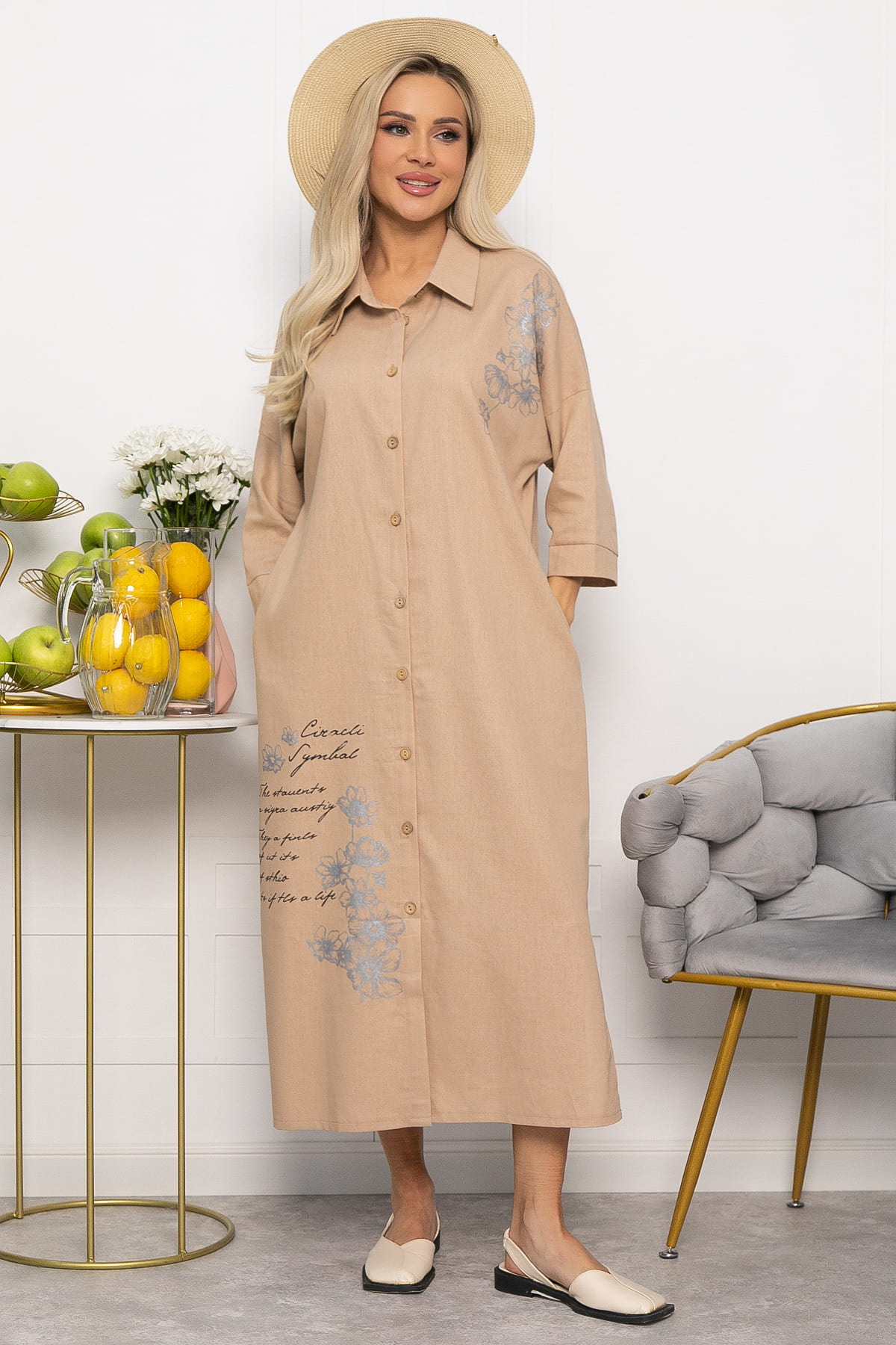 Платье-рубашка свободного кроя в бежевом оттенке — это идеальный выбор для тех, кто ценит комфорт и стиль. Его удобный фасон делает его универсальным для повседневной носки и активного отдыха. Свободный крой не стесняет движений, позволяя вам чувствовать себя комфортно и уверенно в любой ситуации. Талию можно подчеркнуть поясом, который идет в комплекте.