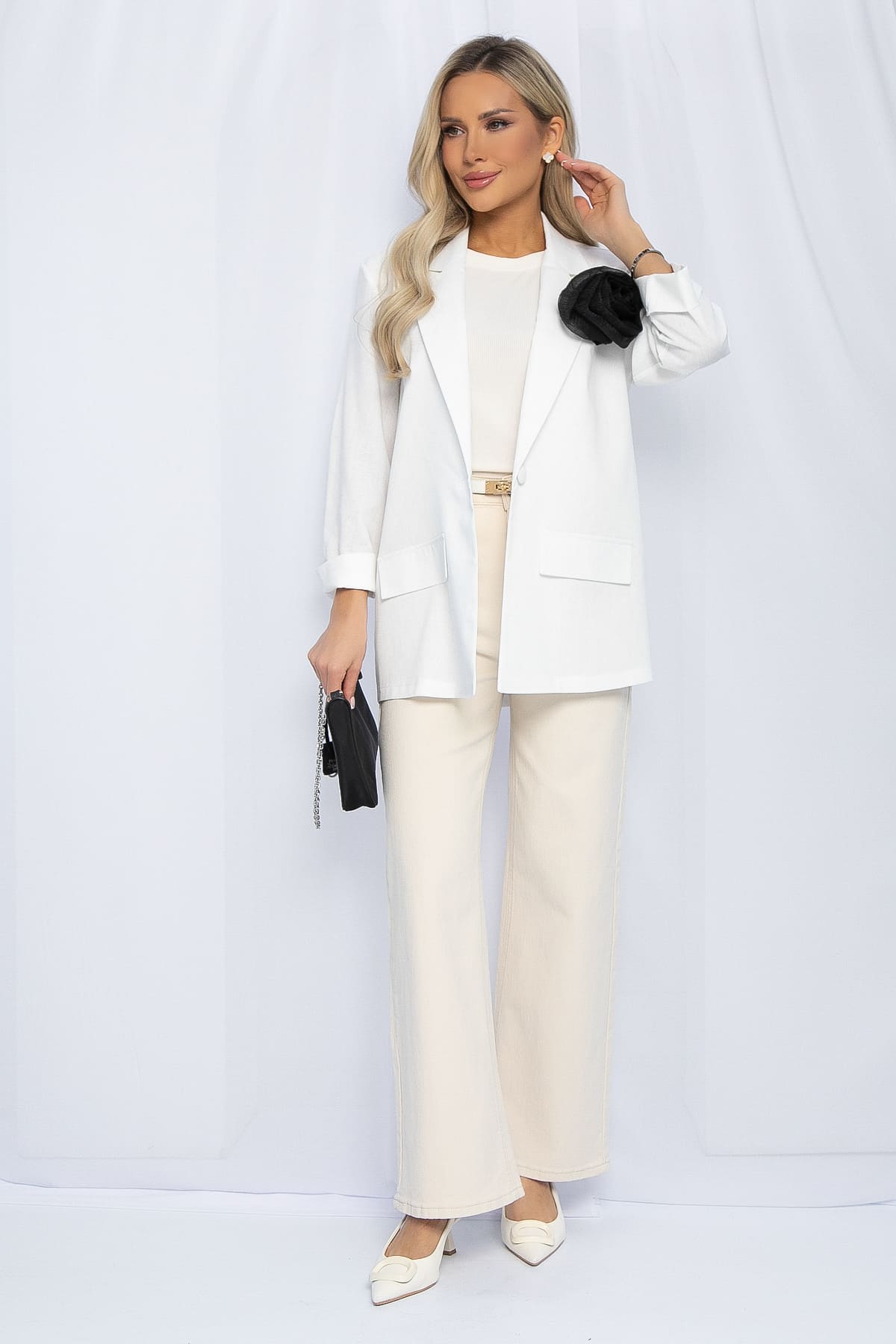 Преобразите свой образ с помощью этого белого пиджака, который станет настоящим украшением вашего гардероба. Цветок, выполненный из органзы, придаст вашему образу неповторимую элегантность и оригинальность, подчеркнув ваш безупречный стиль. Этот пиджак легко сочетается как с классическими брюками и юбками, так и с джинсами и платьями, что делает его универсальным элементом для любого случая.